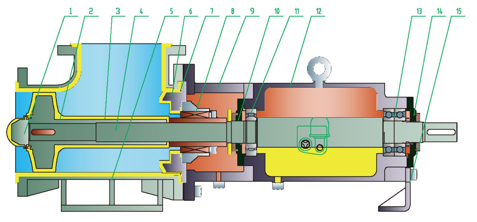 | ① 叶轮螺母 | 钢衬氟塑料/PFA | ⑥ 水泵盖 | 钢衬氟塑料/PFA | ⑪ 前轴承 | Gcr15 |