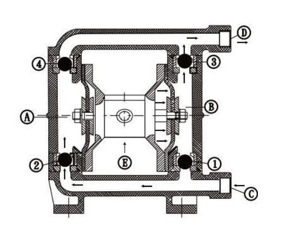 2. 当A段膨胀时,液体通过进水口③被吸入。当液体进入④段时,球阀②打开,阀门④关闭。
